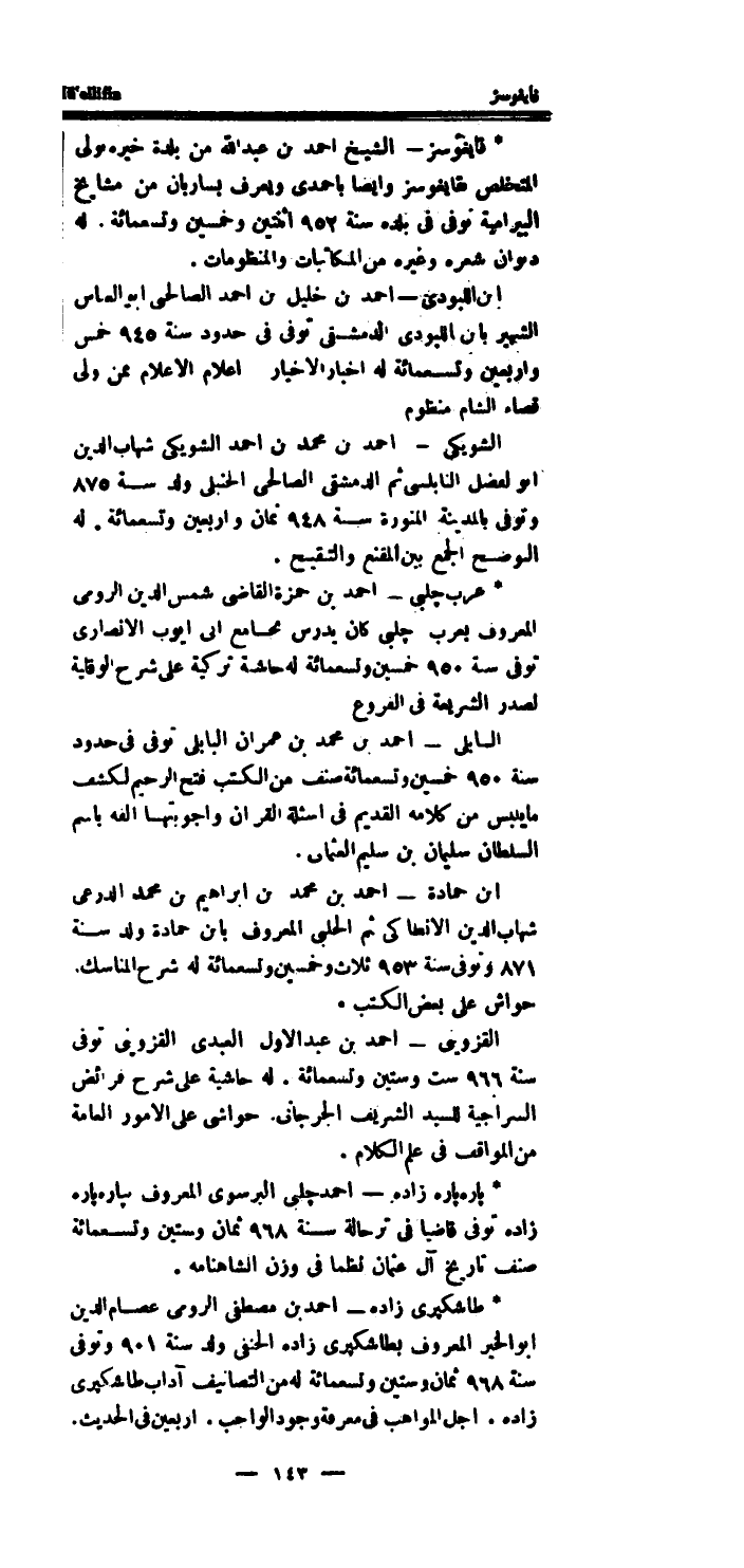 * عرب چلبّى - احْمَد بن حَمْزَة القاضى شمس الدَّين الرُّومِي الْمَعْرُوف بعرب چلبّى كَانَ يدرس بِجَامِع ابى ايوب الانصاري توفى سنة 950 خمسين وَتِسْعمِائَة لَهُ حَاشِيَة تركية على شرح الْوِقَايَة لصدر الشَّرِيعَة فِي الْفُرُوع السابلى - احْمَد بن مُحَمَّد بن عمرَان البابلي توفى فِي حُدُود سنة 950 خمسين وَتِسْعمِائَة صنف من الْكتب فتح الرَّحِيم لكشف مَا يلبس من كَلَامه الْقَدِيم فِي اسئلة الْقرَان واجوبتها الفه باسم السُّلْطَان سُلَيْمَان بن سليم العثماني.
