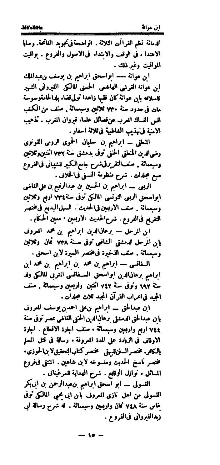 ابْن عوَانَة - أَبُو اسحق ابراهيم بن يُوسُف بن عبد الملك ابْن عوَانَة القرشى الْهَاشِمِي الْحسنى المالكى القيرواني الشهير كاسلافه بِابْن عوَانَة كَانَ فَقِيها زاهدا تولى قَضَاء بلد الحامة وَسْوَسَة مَاتَ فِي حُدُود سنة 730 ثَلَاثِينَ وَسَبْعمائة.