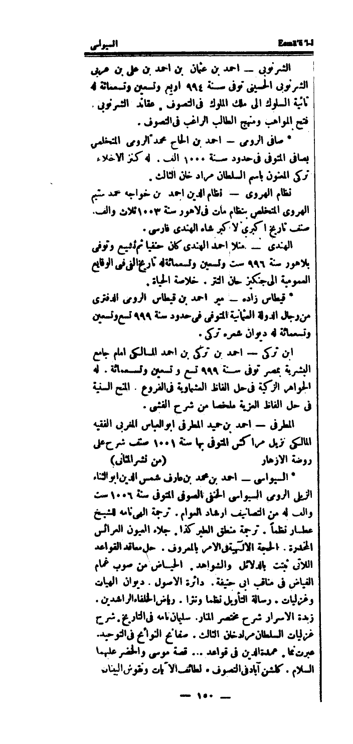الْمَطَر فِي - احْمَد بن حميد الْمَطَر فِي أَبُو الْعَبَّاس المغربي الْفَقِيه المالكى نزيل مراكش الْمُتَوفَّى بهَا سنة 1001 صنف شرح على رَوْضَة الازهار (من نشر المثانى) * السيواسى - احْمَد بن مُحَمَّد بن عَارِف شمس الدَّين أَبُو الثَّنَاء الزيلى الرُّومِي السيواسى الْحَنَفِيّ الصوفى الْمُتَوفَّى سنة 1006 سِتّ والف لَهُ من التصانيف ارشاد الْعَوام.