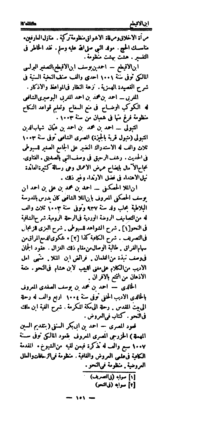 ابْن الاقيطع - احْمَد بن يُوسُف ابْن الاقيطع بِالتَّصْغِيرِ البرلسى المالكى توفى سنة 1001 احدى والف صنف النخبة السّنيَّة فِي شرح القصيدة الهمزية.