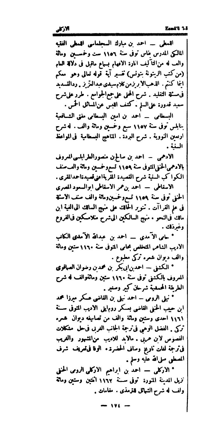 * الاركلى - احْمَد بن ابراهيم الاركلى الرُّومِي الْحَنَفِيّ نزيل الْمَدِينَة المنورة توفى سنة 1162 اثْنَتَيْنِ وَسِتِّينَ وَمِائَة والف لَهُ شرح الشَّمَائِل لِلتِّرْمِذِي.