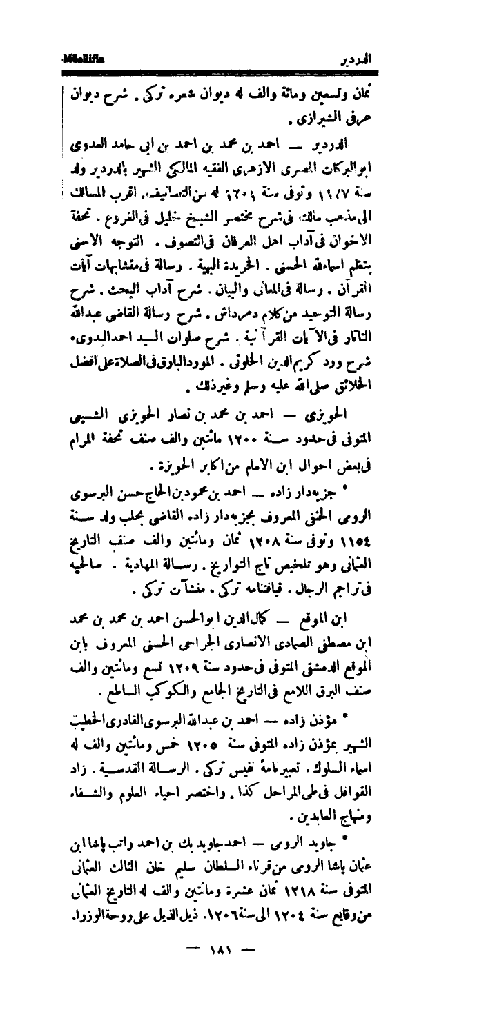 الدردير - احْمَد بن مُحَمَّد بن احْمَد بن ابى حَامِد الْعَدْوى أَبُو البركات المصرى الازهرى الْفَقِيه المالكى الشهير بالدردير ولد سنة 1127 وَتوفى سنة 1201 لَهُ من التصانيف.