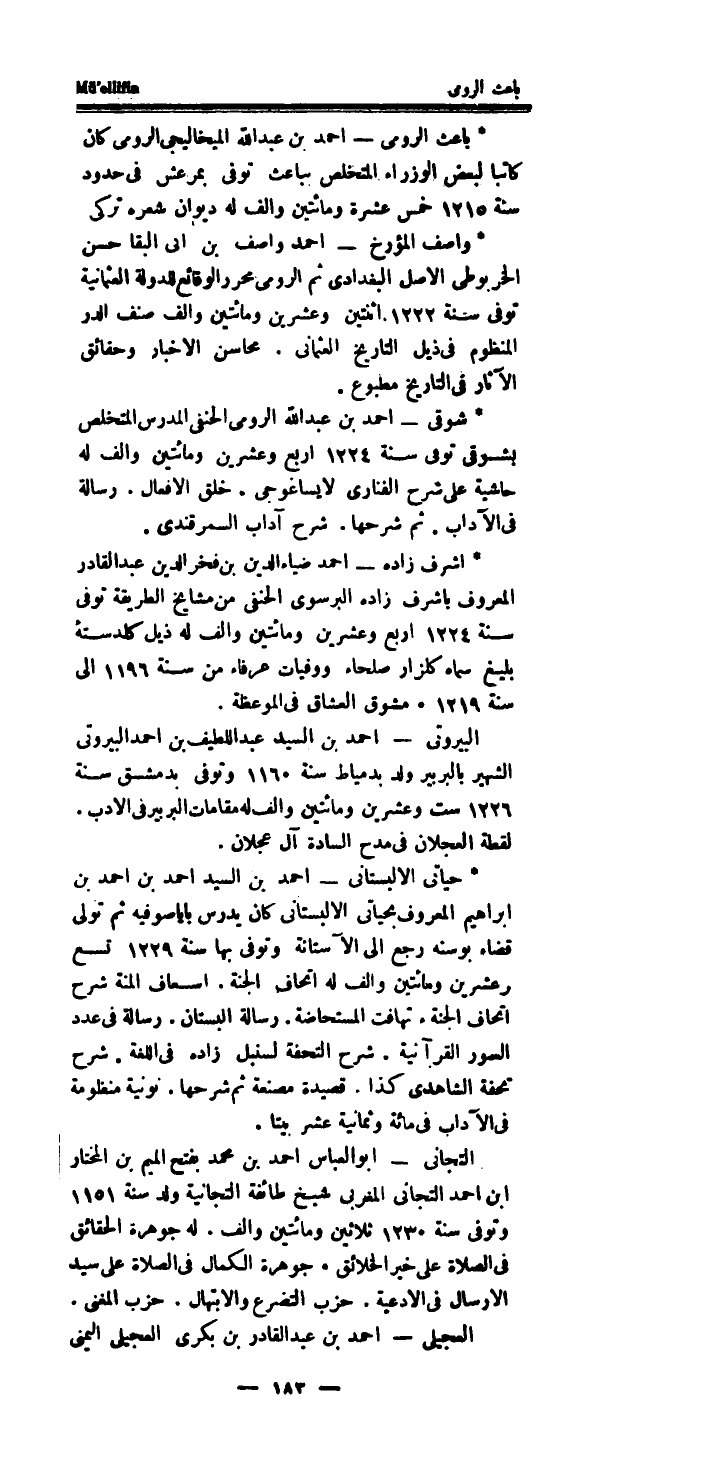 * باعث الرُّومِي - احْمَد بن عبد الله الميخاليجى الرُّومِي كَانَ كَاتبا لبَعض الوزراء المتخلص بباعث توفى بمرعش فِي حُدُود سنة 1215 خمس عشرَة وَمِائَتَيْنِ والف لَهُ ديوَان شعره تركي * واصف المؤرخ - احْمَد واصف بن ابى البقا حسن الخربوطى الاصل الْبَغْدَادِيّ ثمَّ الرُّومِي مُحَرر الوقائع للدولة العثمانية توفى سنة 1222 اثْنَتَيْنِ وَعشْرين وَمِائَتَيْنِ والف صنف الدّرّ المنظوم فِي ذيل التَّارِيخ العثماني.
