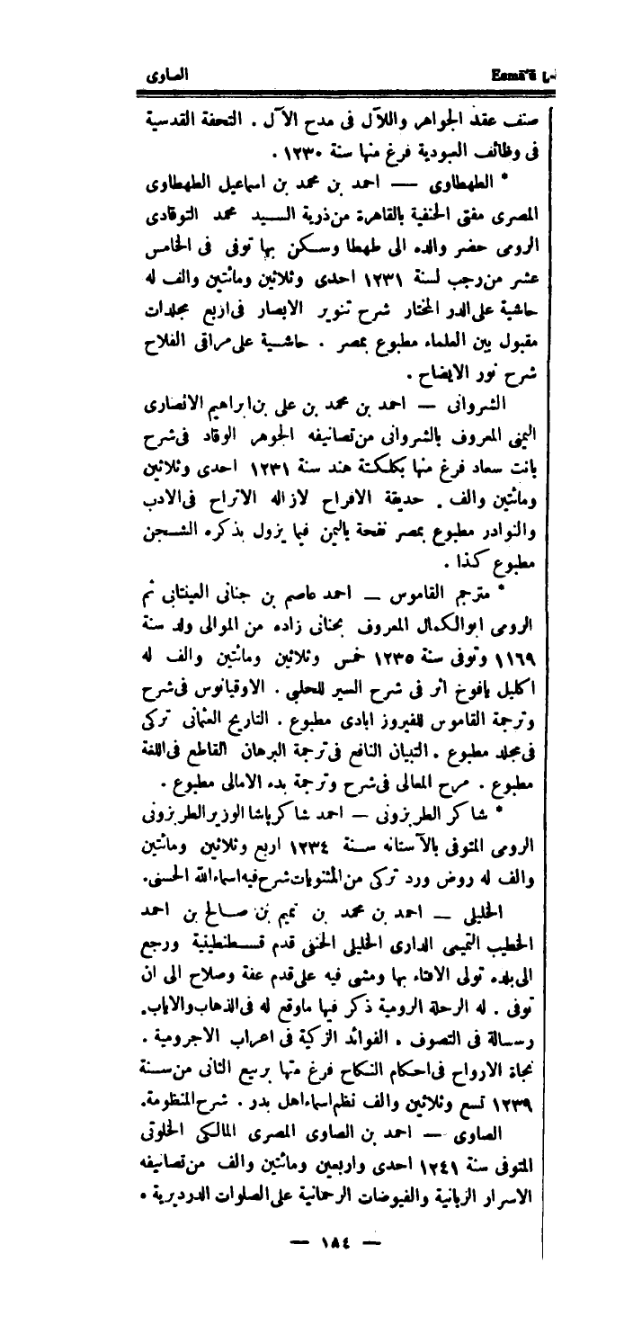 * الطهطاوى - احْمَد بن مُحَمَّد بن اسماعيل الطهطاوى المصرى مفتى الْحَنَفِيَّة بِالْقَاهِرَةِ من ذُرِّيَّة السَّيِّد مُحَمَّد التوقادى الرُّومِي حضر وَالِده إِلَى طهطا وَسكن بهَا توفى فِي الْخَامِس عشر من رَجَب لسنة 1231 احدى وَثَلَاثِينَ وَمِائَتَيْنِ والف لَهُ حَاشِيَة على الدّرّ الْمُخْتَار شرح تنوير الابصار فِي ارْبَعْ مجلدات مَقْبُول بَين الْعلمَاء مطبوع بِمصْر.