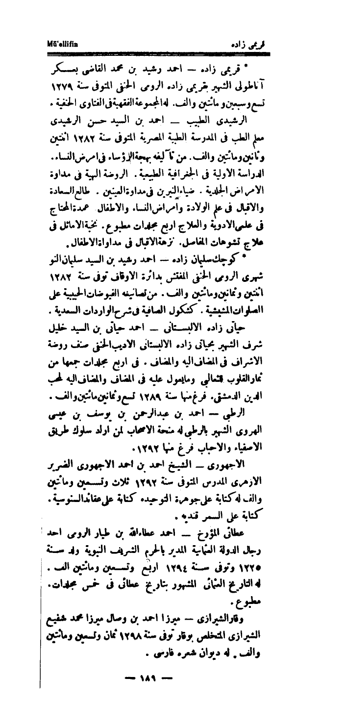 * قريمى زَاده - احْمَد رشيد بن مُحَمَّد القاضى بعسكر آناطولى الشهير بقريمى زَاده الرُّومِي الْحَنَفِيّ الْمُتَوفَّى سنة 1279 تسع وَسبعين وَمِائَتَيْنِ والف.