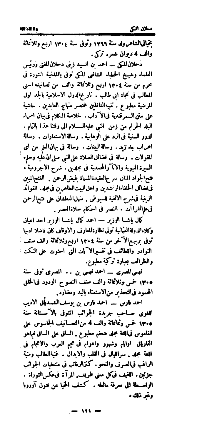 دحلان المكى - احْمَد بن السَّيِّد زينى دحلان الْمُفْتى وَرَئِيس الْعلمَاء وَشَيخ الخطباء الشَّافِعِي المكى توفى بِالْمَدَنِيَّةِ المنورة فِي محرم من سنة 1304 ارْبَعْ وثلاثمائة والف من تصانيفه اسنى المطالب فِي نجاة ابى طَالب.