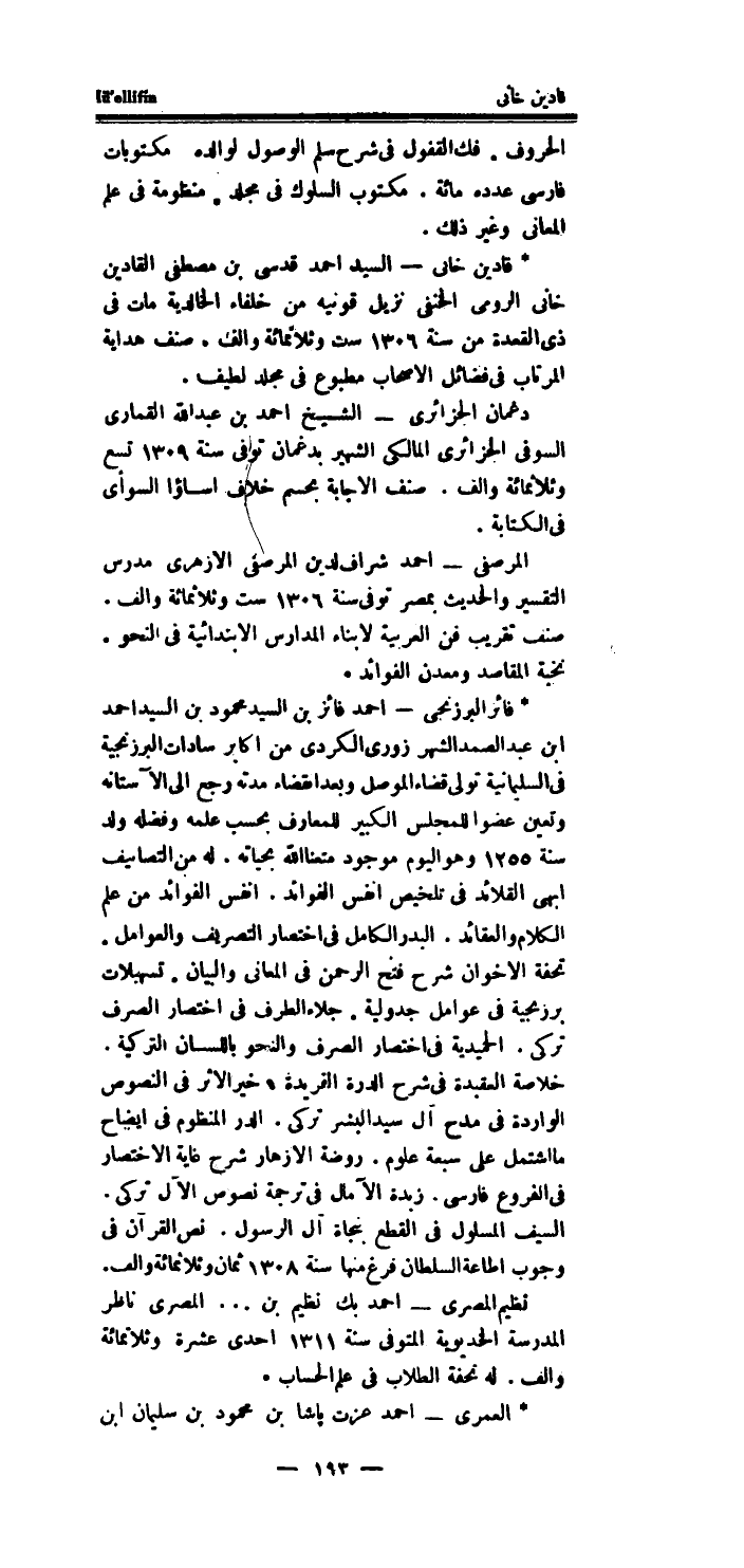 * قادين خانى - السَّيِّد احْمَد قدسي بن مصطفى القادين خانى الرُّومِي الْحَنَفِيّ نزيل قونيه من خلفاء الخالدية مَاتَ فِي ذى الْقعدَة من سنة 1306 سِتّ وثلاثمائة والف.