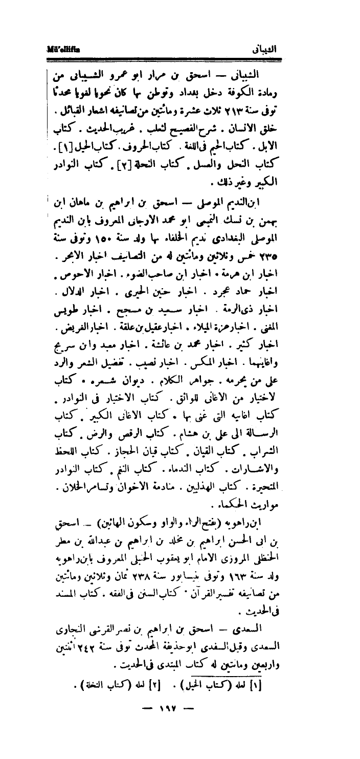 ابْن النديم الْموصِلِي - اسحق بن ابراهيم بن ماهان ابْن بهمن بن نسك التَّمِيمِي أَبُو مُحَمَّد الارجانى الْمَعْرُوف بِابْن النديم الْموصِلِي الْبَغْدَادِيّ نديم الْخُلَفَاء بهَا ولد سنة 150 وَتوفى سنة 235 خمس وَثَلَاثِينَ وَمِائَتَيْنِ لَهُ من التصانيف اخبار الابحر.