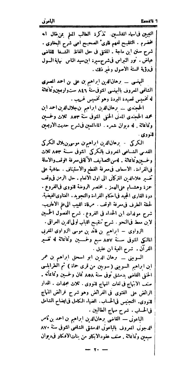 الباعونى - القاضى برهَان الدَّين ابراهيم بن احْمَد بن ثامر الدجونى الْمَعْرُوف بالباعونى الدِّمَشْقِي الشَّافِعِي الْمُتَوفَّى سنة 870 سبعين وَثَمَانمِائَة.