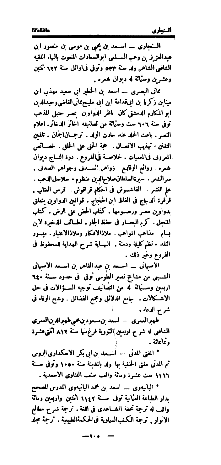 * اليانيه وى - اِسْعَدْ بن مُحَمَّد اليانيه وى الْمدرس الْمُصَحح بدار الطباعة العثمانية توفى سنة 1142 اثْنَتَيْنِ واربعين وَمِائَة والف لَهُ تَرْجَمَة تحفة الشاهدى فِي اللُّغَة.