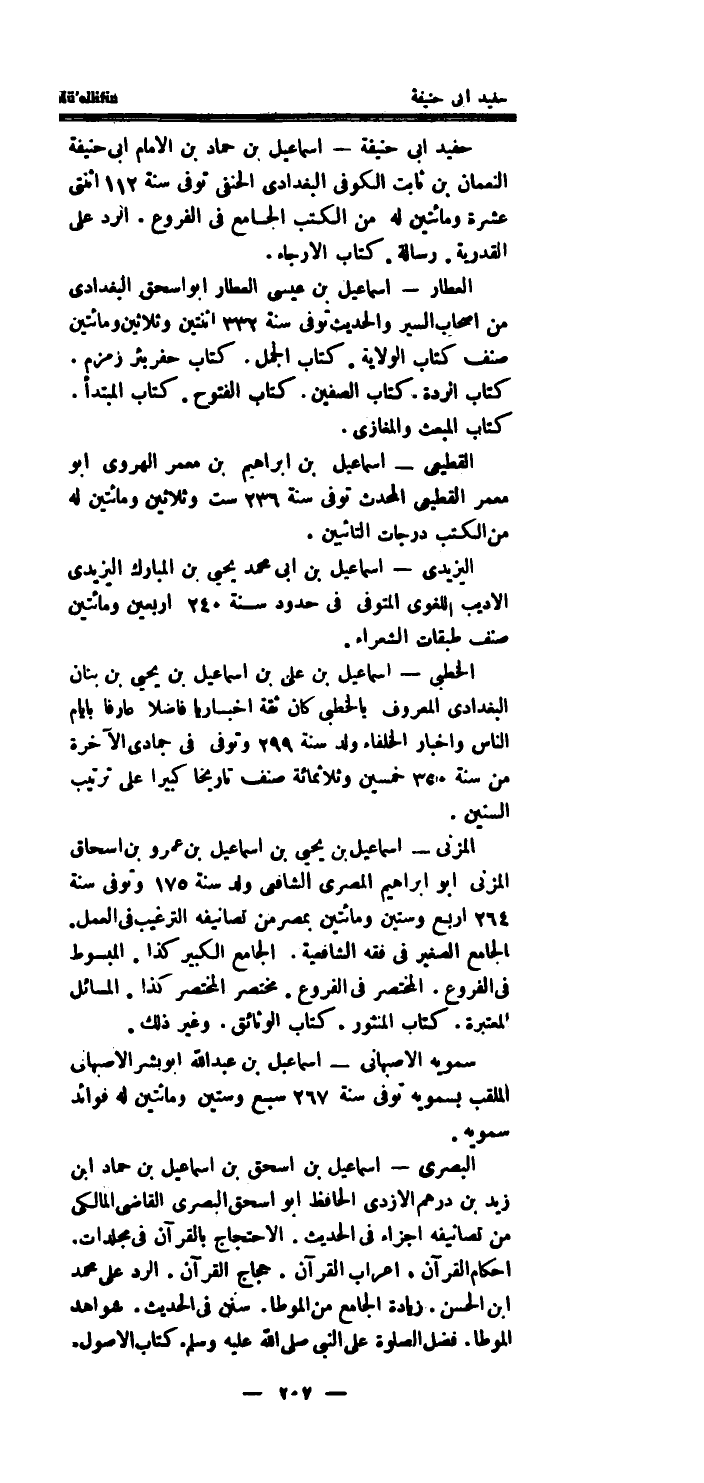 حفيد ابى حنيفَة - اسماعيل بن حَمَّاد بن الامام ابى حنيفَة النُّعْمَان بن ثَابت الكوفى الْبَغْدَادِيّ الْحَنَفِيّ توفى سنة 112 اثنتى عشرَة وَمِائَتَيْنِ لَهُ من الْكتب الْجَامِع فِي الْفُرُوع.