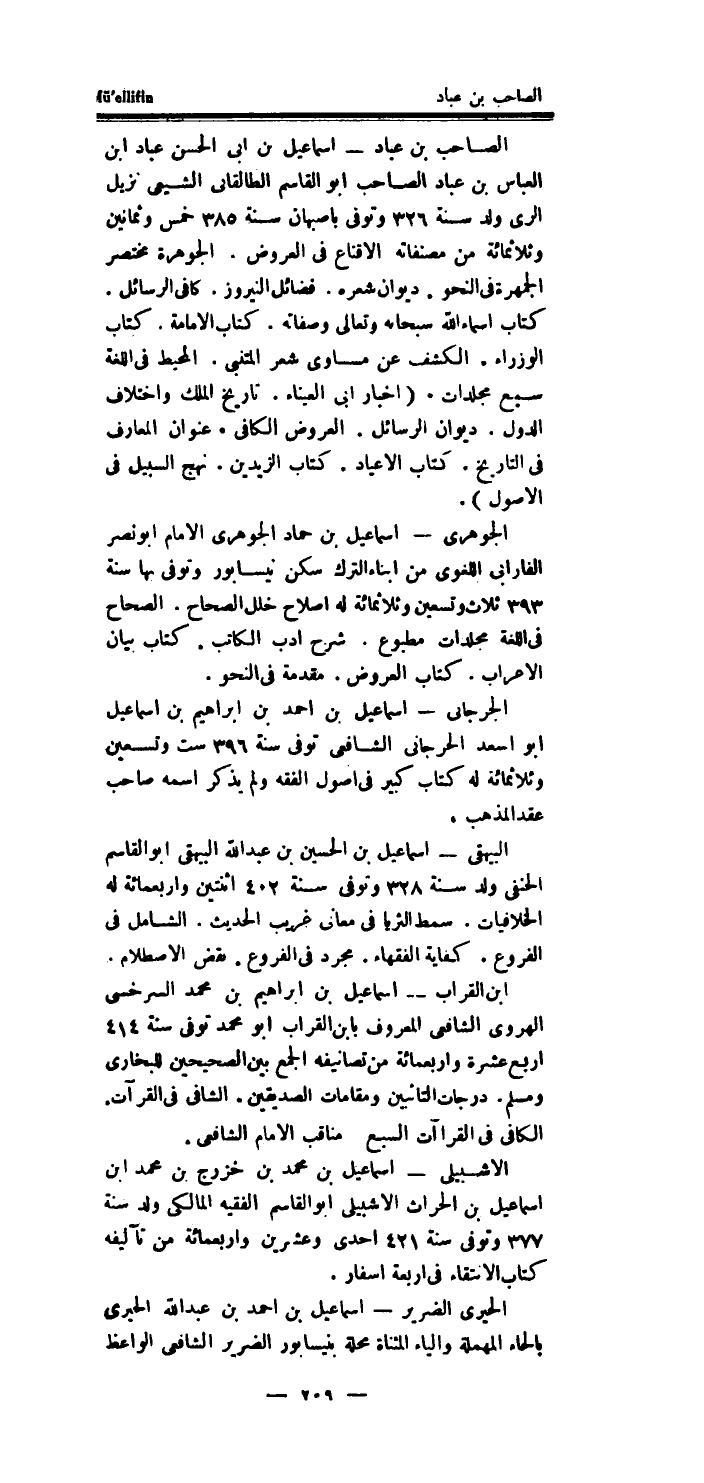 الصاحب بن عباد - اسماعيل ين ابى الْحسن عباد ابْن الْعَبَّاس بن عباد الصاحب أَبُو الْقَاسِم الطَّالقَانِي الشيعي نزيل الرى ولد سنة 326 وَتوفى باصبهان سنة 385 خمس وَثَمَانِينَ وثلاثمائة من مصنفاته الاقناع فِي الْعرُوض.