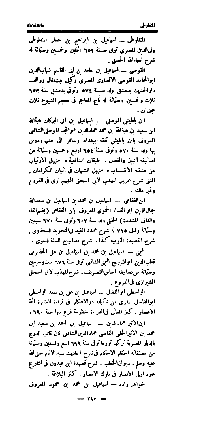 المنفلوطى - اسماعيل بن ابراهيم بن جَعْفَر المنفلوطى ولى الدَّين المصرى توفى سنة 652 اثْنَتَيْنِ وَخمسين وسِتمِائَة لَهُ شرح اسماء الله الْحسنى.