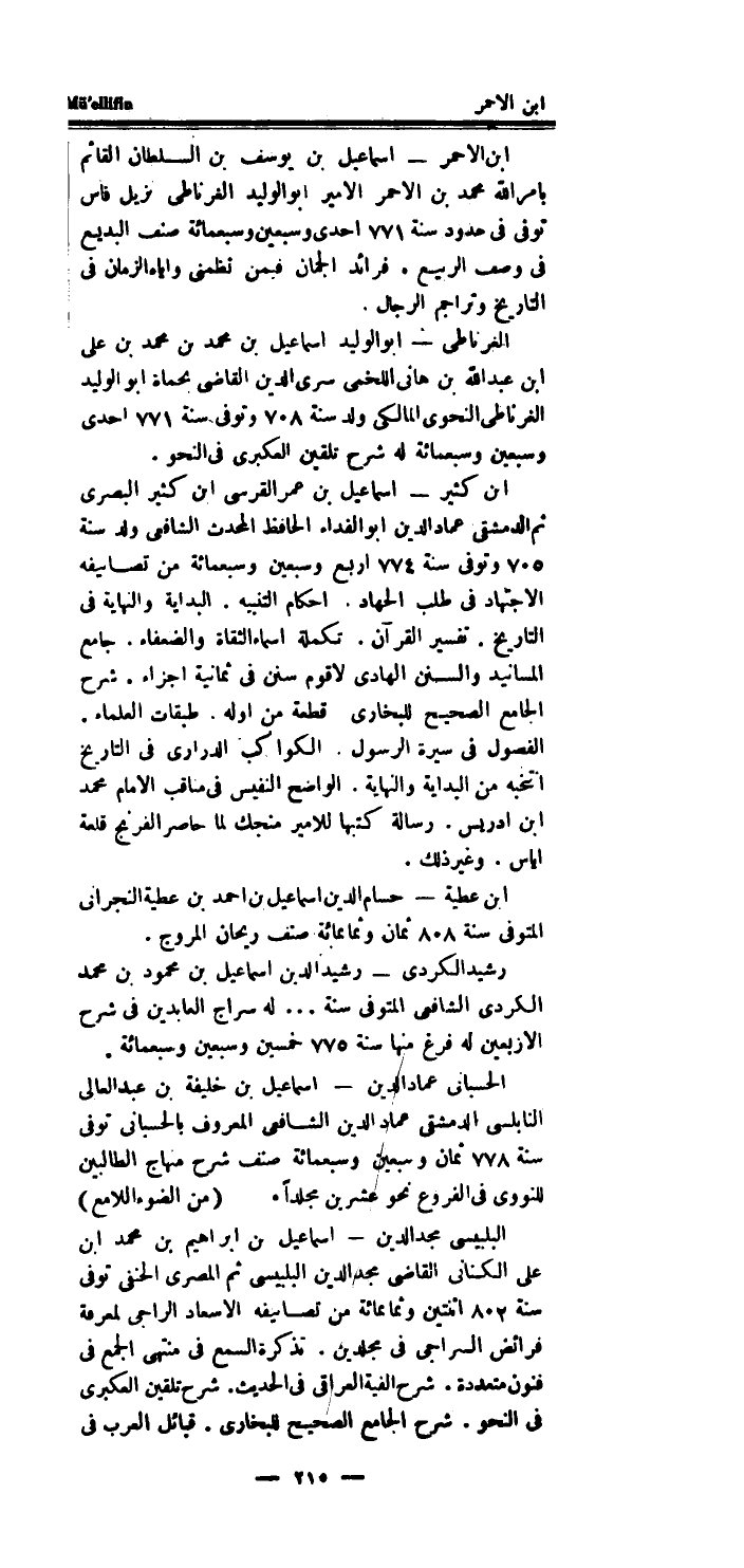 (من الضَّوْء اللامع) البلبيسى مجد الدَّين - اسماعيل بن ابراهيم بن مُحَمَّد ابْن على الكنانى القاضى مجد الدَّين البلبيسى ثمَّ المصرى الْحَنَفِيّ توفى سنة 802 اثْنَتَيْنِ وَثَمَانمِائَة من تصانيفه الاسعاد الراجى لمعْرِفَة فَرَائض السراجى فِي مجلدين.