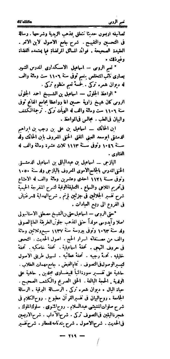 * نعيم الرُّومِي - اسماعيل الاسكدارى الْمدرس الشهير بصارى نَائِب المتخلص بنعيم توفى سنة 1106 سِتّ وَمِائَة والف لَهُ ديوَان شعره تركي.