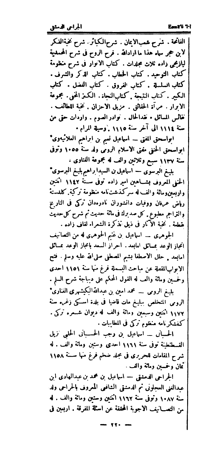 الجراحى الدِّمَشْقِي - اسماعيل بن مُحَمَّد بن عبد الْهَادِي ابْن عبد الْغنى العجلونى ثمَّ الدِّمَشْقِي الشَّافِعِي الْمَعْرُوف بالجراحى ولد سنة 1087 وَتوفى سنة 1162 اثْنَتَيْنِ وَسِتِّينَ وَمِائَة والف.