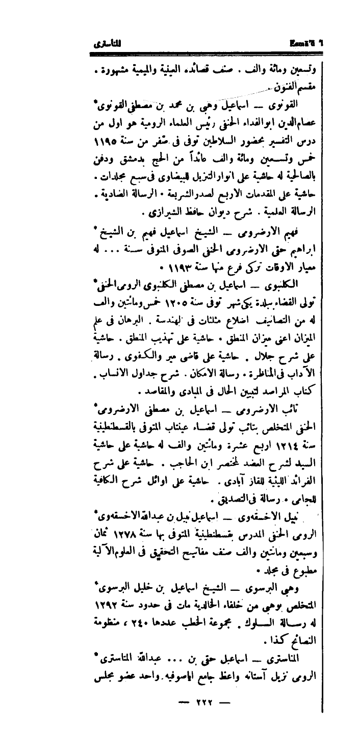 القونوى - اسماعيل وهبى بن مُحَمَّد بن مصطفى القونوى * عِصَام الدَّين أَبُو الْفِدَاء الْحَنَفِيّ رَئِيس الْعلمَاء الرومية هُوَ اول من درس التَّفْسِير بِحُضُور السلاطين توفى فِي صفر من سنة 1195 خمس وَتِسْعين وَمِائَة والف عَائِدًا من الْحَج بِدِمَشْق وَدفن بالصالحية لَهُ حَاشِيَة على انوار التَّنْزِيل للبيضاوي فِي سبع مجلدات.
