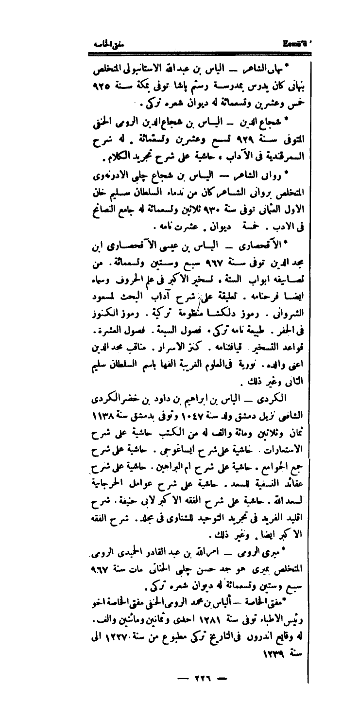 * مفتى الْخَاصَّة - الياس بن مُحَمَّد الرُّومِي الْحَنَفِيّ مفتى الْخَاصَّة اخو رَئِيس الاطباء توفى سنة 1281 احدى وَثَمَانِينَ وَمِائَتَيْنِ والف.