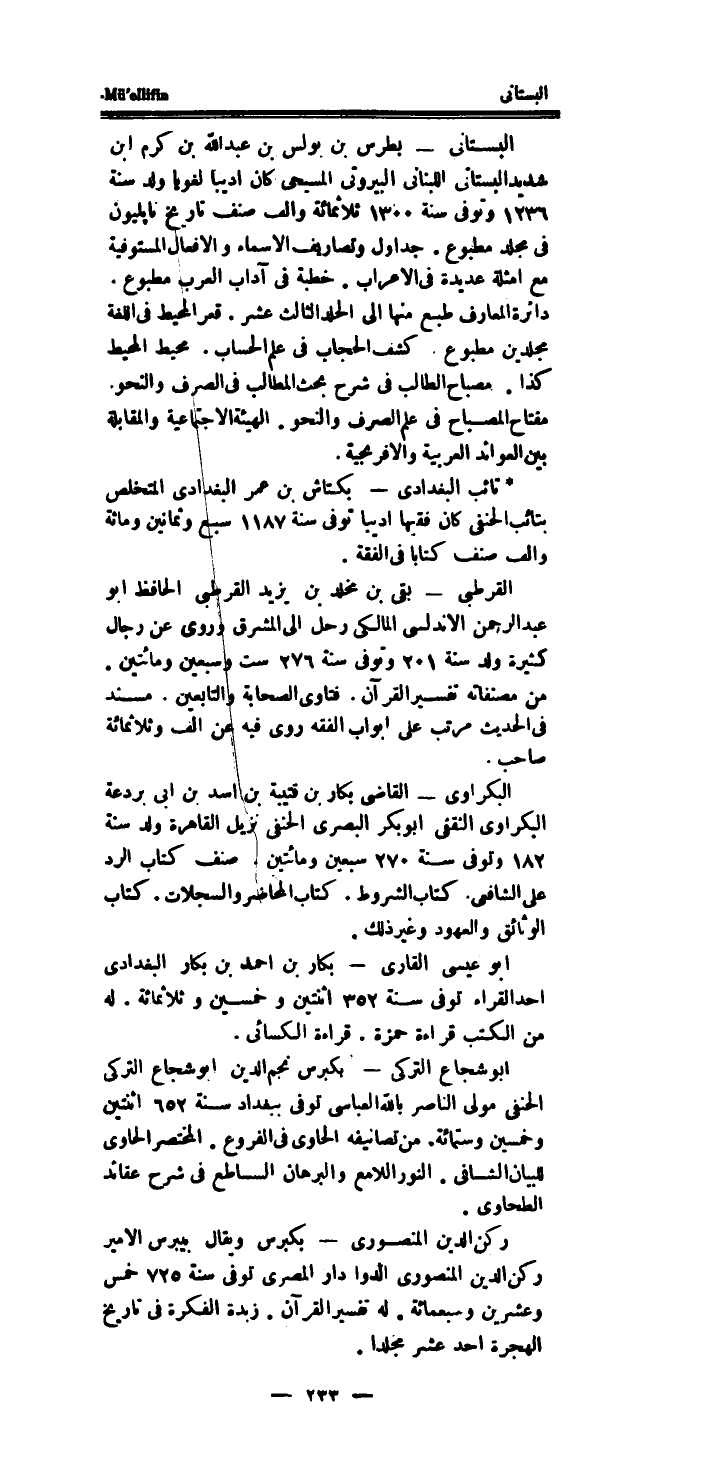 البستانى - بطرس بن بولس بن عبد الله بن كرم ابْن شَدِيد البستانى اللبناني البيروتى المسيحي كَانَ اديبا لغويا ولد سنة 1236 وَتوفى سنة 1300 ثَلَاثمِائَة والف صنف تَارِيخ نَاپليون فِي مُجَلد مطبوع.