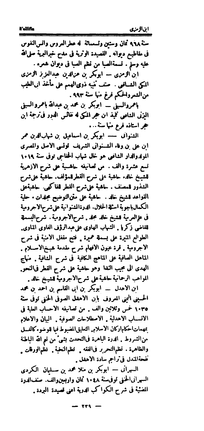 السهرانى - أَبُو بكر بن منلا مُحَمَّد بن سُلَيْمَان الكردى السهرانى الْحَنَفِيّ توفى سنة 1048 ثَمَان واربعين والف.