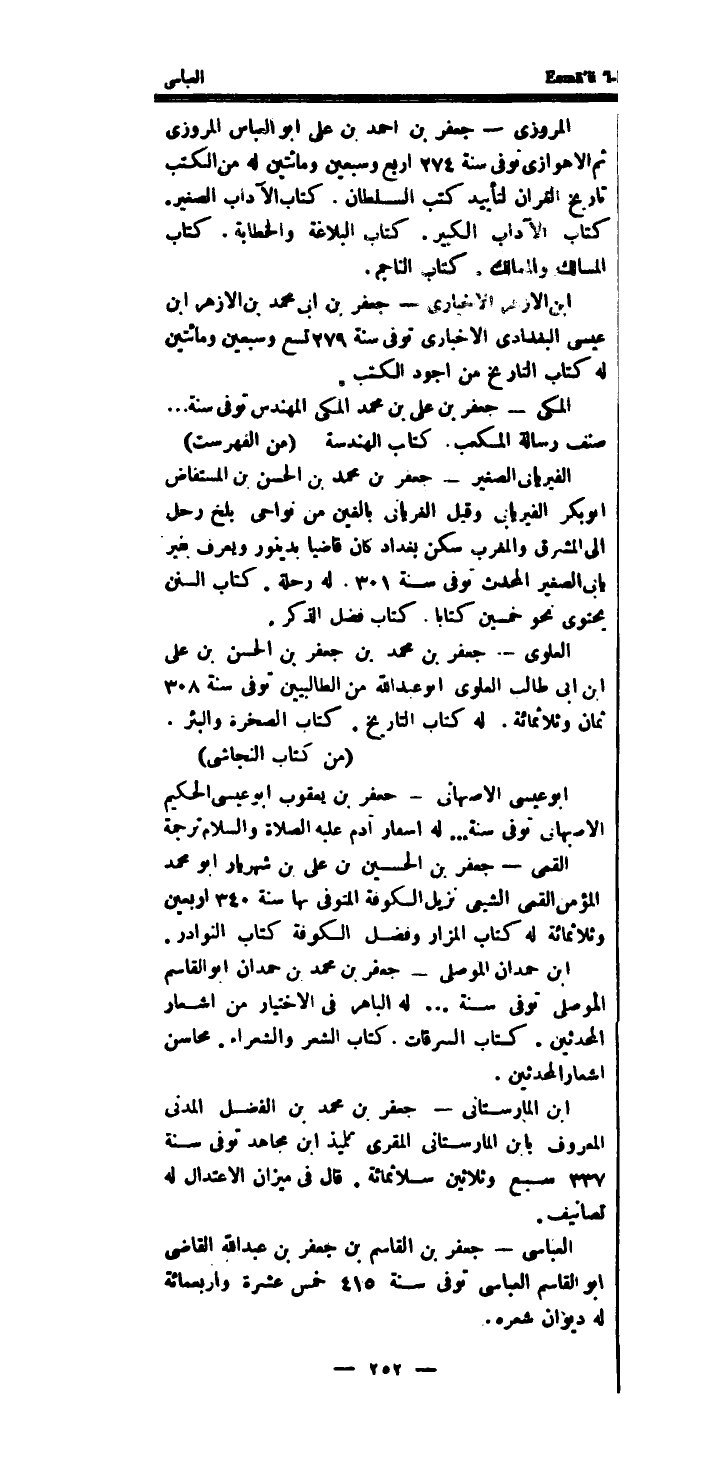 كتاب الهندسة (من الفهرست) الفيريابى الصَّغِير - جَعْفَر بن مُحَمَّد بن الْحسن بن المستفاض أَبُو بكر الفيريابى وَقيل الغريانى بالغين من نواحى بَلخ رَحل إِلَى الْمشرق وَالْمغْرب سكن بَغْدَاد كَانَ قَاضِيا بدينور وَيعرف بفير يابى الصَّغِير الْمُحدث توفى سنة 301.