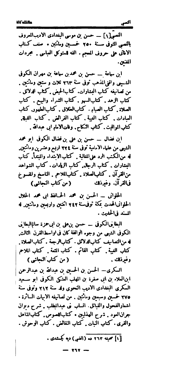 (من كتاب النَّجَاشِيّ) السكرى - الْحسن بن الْحُسَيْن بن عبد الله بن عبد الرحمن ابْن الْعَلَاء بن ابى صفرَة بن الْمُهلب العتكى الكوفى أَبُو سعيد السكرى الْبَغْدَادِيّ الاديب النَّحْوِيّ ولد سنة 212 وَتوفى سنة 275 خمسين وَسبعين وَمِائَتَيْنِ.