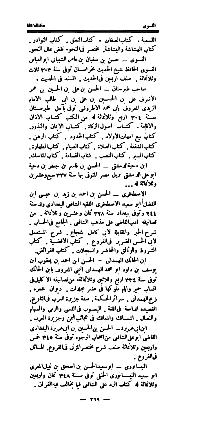 النسوي - حسن بن سُفْيَان بن عَامر الشَّيْبَانِيّ أَبُو الْعَبَّاس النسوي الْحَافِظ شيخ الحَدِيث بخراسان توفى سنة 303 ثَلَاث وثلاثمائة.