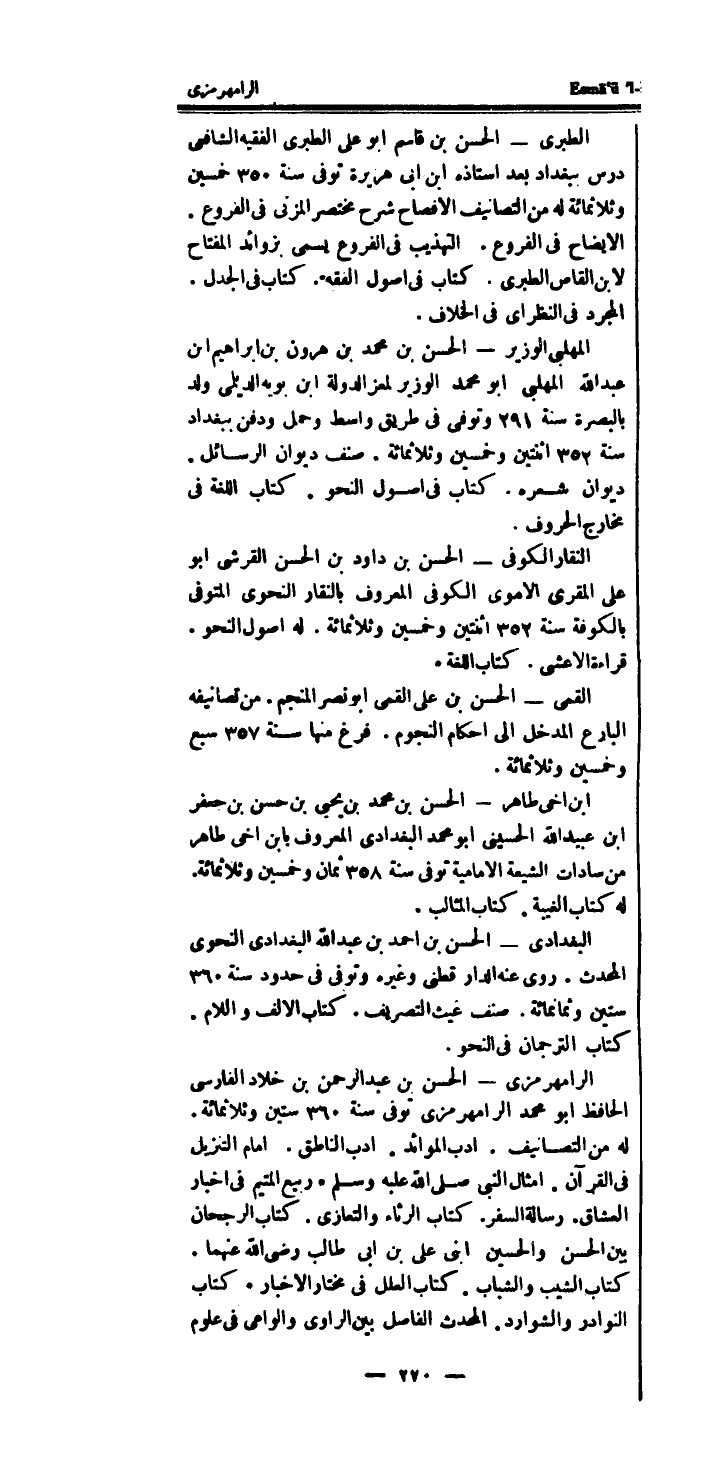 الرامهرمزى - الْحسن بن عبد الرحمن بن خَلاد الفارسى الْحَافِظ أَبُو مُحَمَّد الرامهرمزى توفى سنة 360 سِتِّينَ وثلاثمائة.