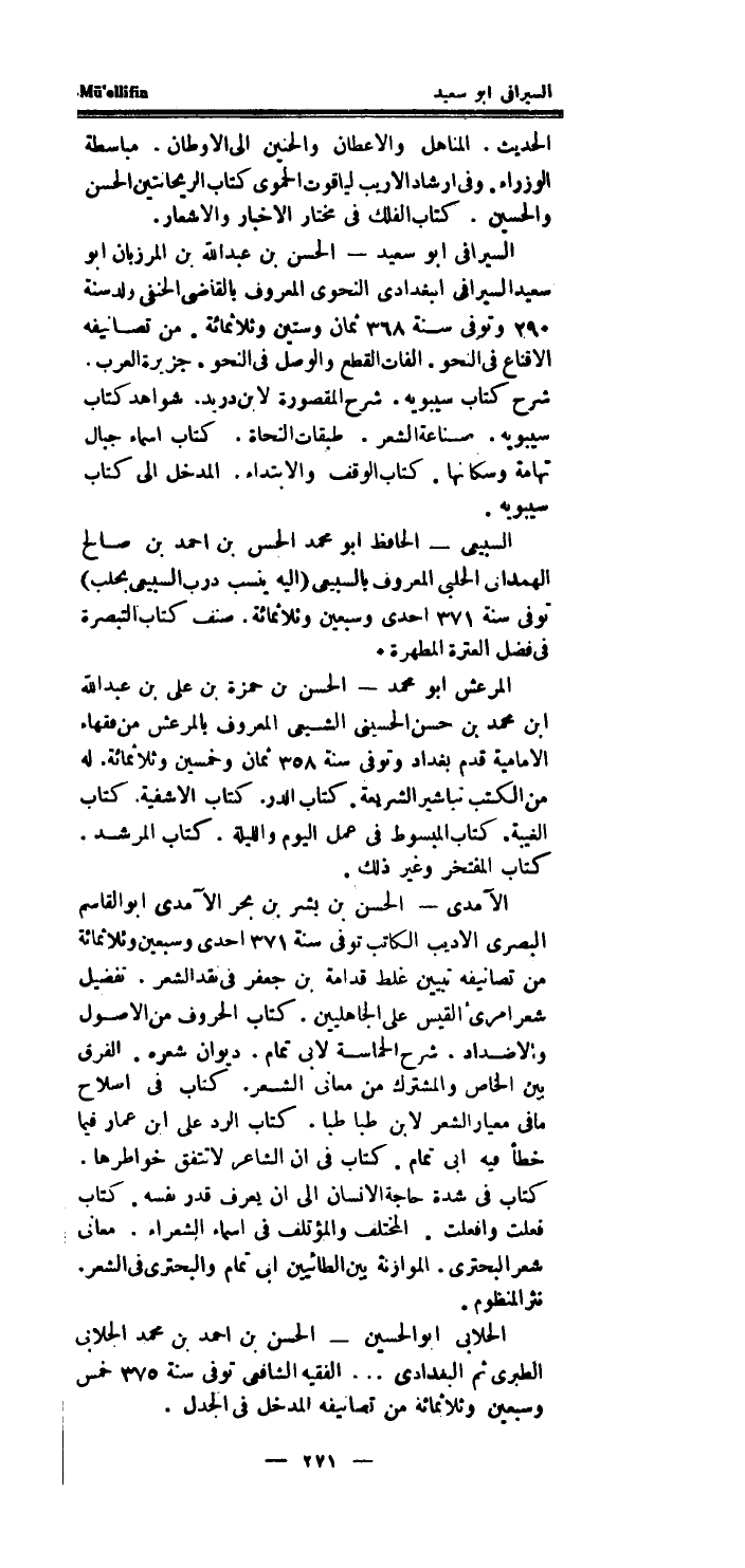 السيرافى أَبُو سعيد - الْحسن بن عبد الله بن الْمَرْزُبَان أَبُو سعيد السيرافى الْبَغْدَادِيّ النَّحْوِيّ الْمَعْرُوف بِالْقَاضِي الْحَنَفِيّ ولد سنة 290 وَتوفى سنة 368 ثَمَان وَسِتِّينَ وثلاثمائة.