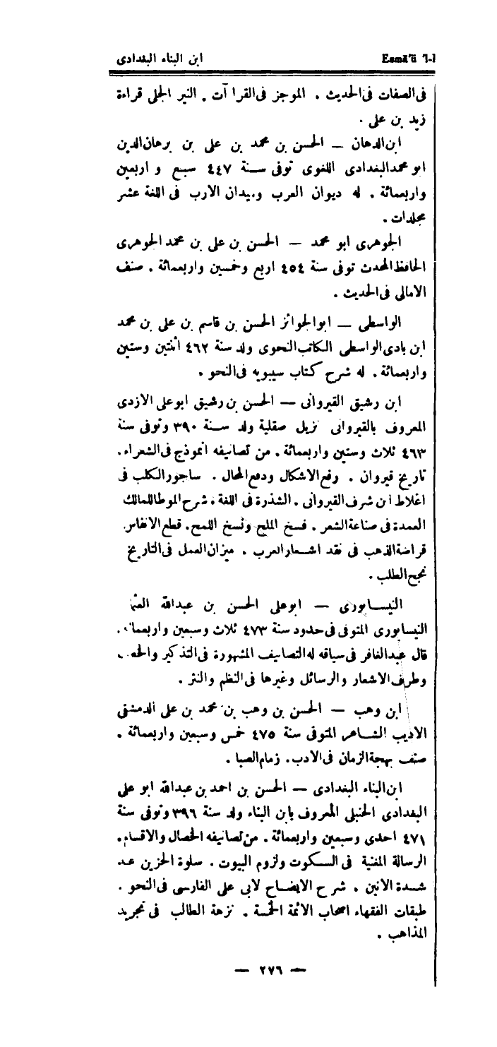 ابْن الْبناء الْبَغْدَادِيّ - الْحسن بن احْمَد بن عبد الله أَبُو على الْبَغْدَادِيّ الحنبلى الْمَعْرُوف بِابْن الْبناء ولد سنة 396 وَتوفى سنة 471 احدى وَسبعين واربعمائة.