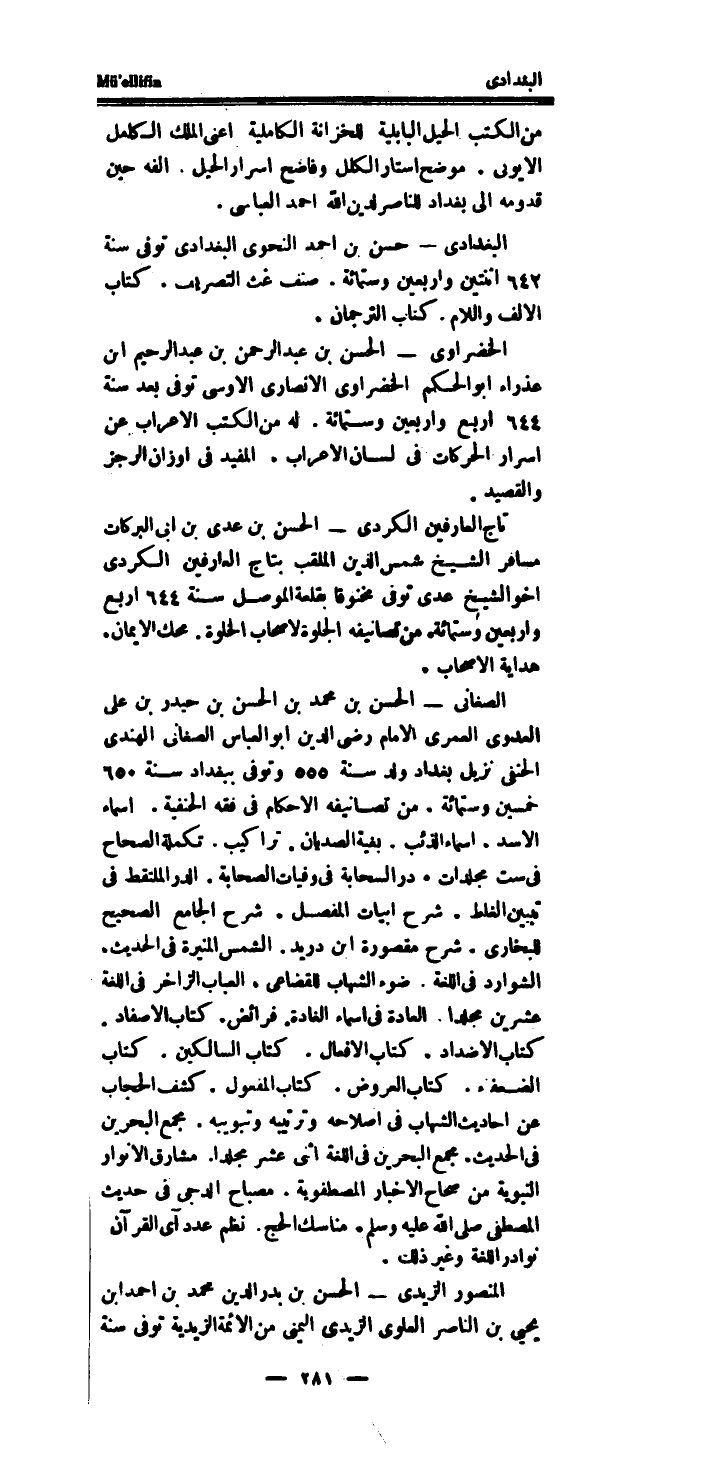 الصغانى - الْحسن بن مُحَمَّد بن الْحسن بن حيدر بن على الْعَدْوى الْعُمْرَى الامام رضى الدَّين أَبُو الْعَبَّاس الصغانى الْهِنْدِيّ الْحَنَفِيّ نزيل بَغْدَاد ولد سنة 555 وَتوفى بِبَغْدَاد سنة 650 خمسين وسِتمِائَة.