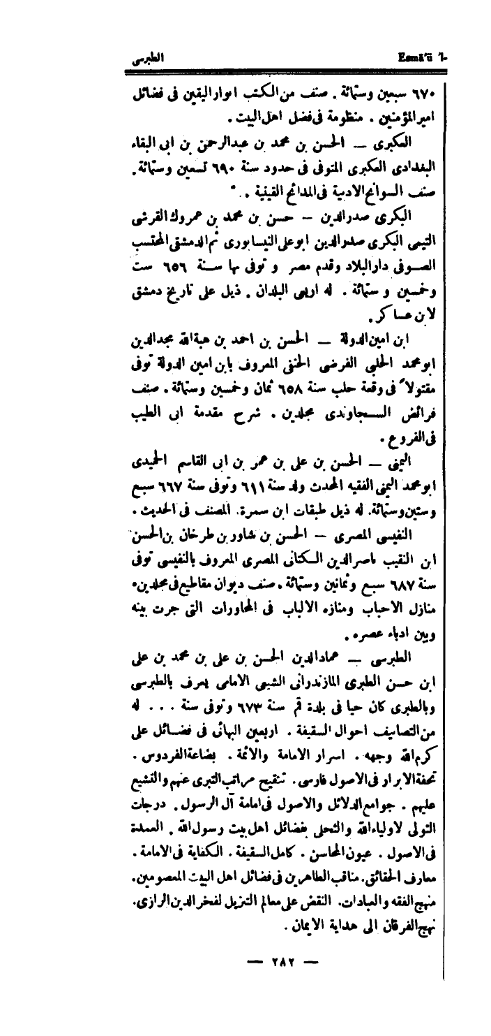 الطبرسي - عماد الدَّين الْحسن بن على بن مُحَمَّد بن على ابْن حسن الطَّبَرِيّ المازندرانى الشيعي الامامي يعرف بالطبرسى وبالطبري كَانَ حَيا فِي بَلْدَة قُم سنة 673 وَتوفى سنة ...