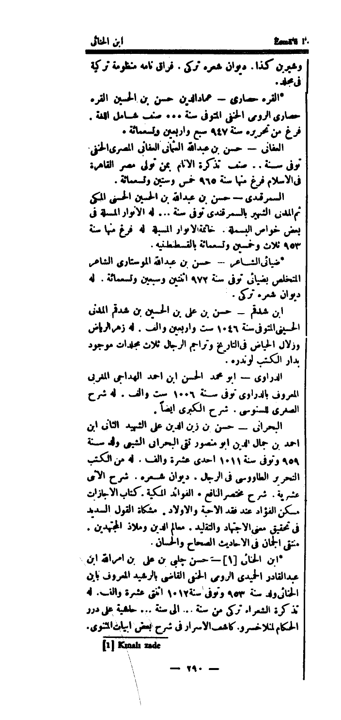 * ابْن الحنائى [1]- حسن چلبّى بن على بن امْر الله ابْن عبد الْقَادِر الحميدى الرُّومِي الْحَنَفِيّ القاضى بالرشيد الْمَعْرُوف بِابْن الحنائى ولد سنة 953 وَتوفى سنة 1012 اثنتى عشرَة والف.