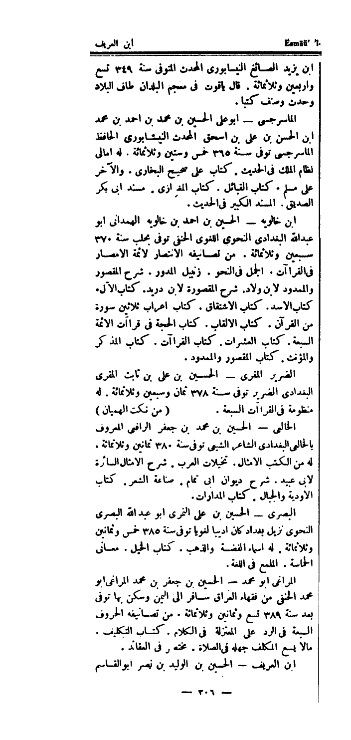 ابْن خالويه - الْحُسَيْن بن احْمَد بن خالويه الْهَمدَانِي أَبُو عبد الله الْبَغْدَادِيّ النَّحْوِيّ اللغوى الْحَنَفِيّ توفى بحلب سنة 370 سبعين وثلاثمائة.