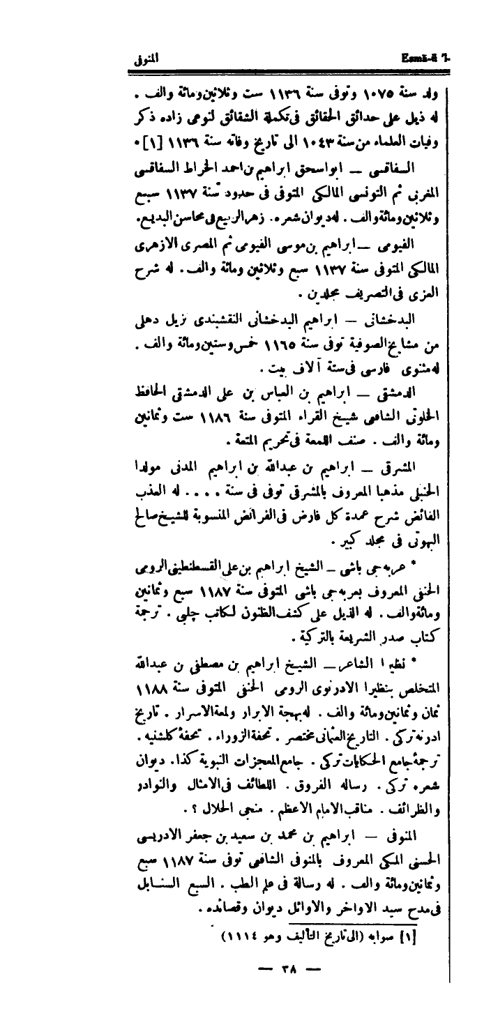 ولد سنة 1075 وَتوفى سنة 1136 سِتّ وَثَلَاثِينَ وَمِائَة والف * لَهُ ذيل على حدائق الْحَقَائِق فِي تَكْمِلَة الشقائق لنوعي زَاده ذكر وفيات الْعلمَاء من سنة 1043 إِلَى تَارِيخ وَفَاته سنة 1136 [1] * السفاقسى - أَبُو اسحق ابراهيم بن احْمَد الْخَرَّاط السفاقسى المغربي ثمَّ التونسى المالكى الْمُتَوفَّى فِي حُدُود سنة 1137 سبع وَثَلَاثِينَ وَمِائَة والف.