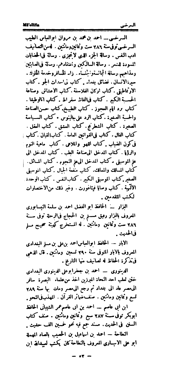 السرخسى - احْمَد بن مُحَمَّد بن مَرْوَان أَبُو الْعَبَّاس الطَّبِيب السرخسى توفى سنة 286 سِتّ وَثَمَانِينَ وَمِائَتَيْنِ.