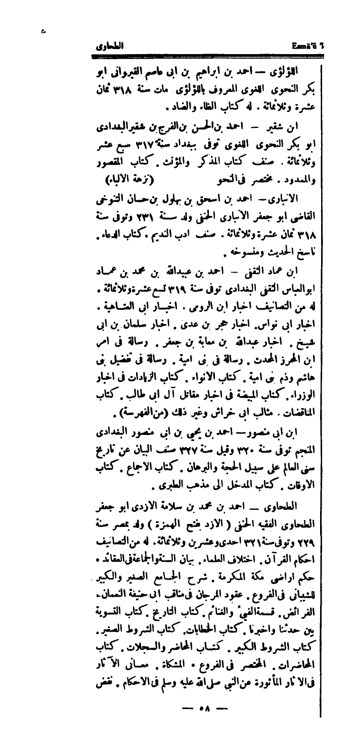 الطَّحَاوِيّ - احْمَد بن مُحَمَّد بن سَلامَة الازدي أَبُو جَعْفَر الطَّحَاوِيّ الْفَقِيه الْحَنَفِيّ (الازد بِفَتْح الْهمزَة) ولد بِمصْر سنة 229 وَتوفى سنة 321 احدى وَعشْرين وثلاثمائة.