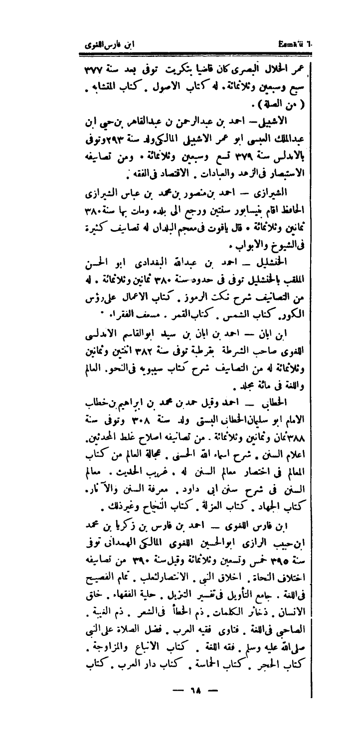 ابْن فَارس اللغوى - احْمَد بن فَارس بن زَكَرِيَّا بن مُحَمَّد ابْن حبيب الرَّازِيّ أَبُو الْحُسَيْن اللغوى المالكى الْهَمدَانِي توفى سنة 395 خمس وَتِسْعين وثلاثمائة وَقيل سنة 390 من تصانيفه اخْتِلَاف النُّحَاة.
