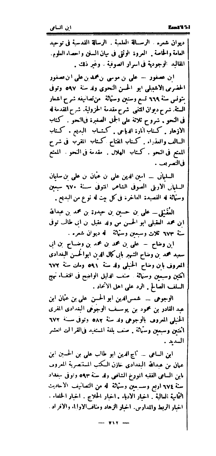السليمانى - امين الدَّين على بن عُثْمَان بن على بن سُلَيْمَان السليمانى الاربلي الصوفى الشَّاعِر الْمُتَوفَّى سنة 670 سبعين وسِتمِائَة لَهُ القصيدة الفاخرة فِي كل بَيت لَهُ نوع من البديع.