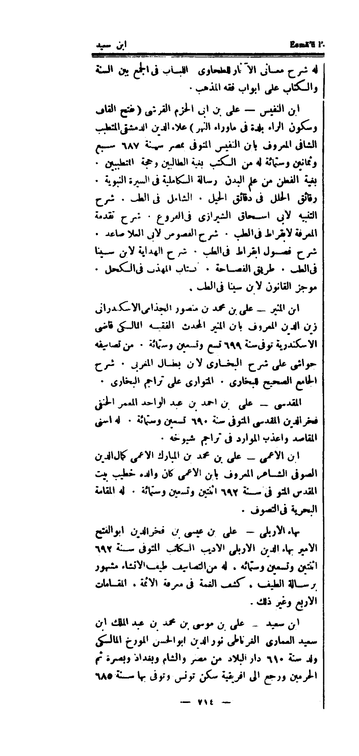 ابْن النفيس - على بن ابى الحزم القرشى (بِفَتْح الْقَاف وَسُكُون الرَّاء بَلْدَة فِي مَا وَرَاء النَّهر) عَلَاء الدَّين الدِّمَشْقِي المتطبب الشافي الْمَعْرُوف بِابْن النفيس الْمُتَوفَّى بِمصْر سنة 687 سبع وَثَمَانِينَ وسِتمِائَة لَهُ من الْكتب بغية الطالبين وَحجَّة المتطببين.
