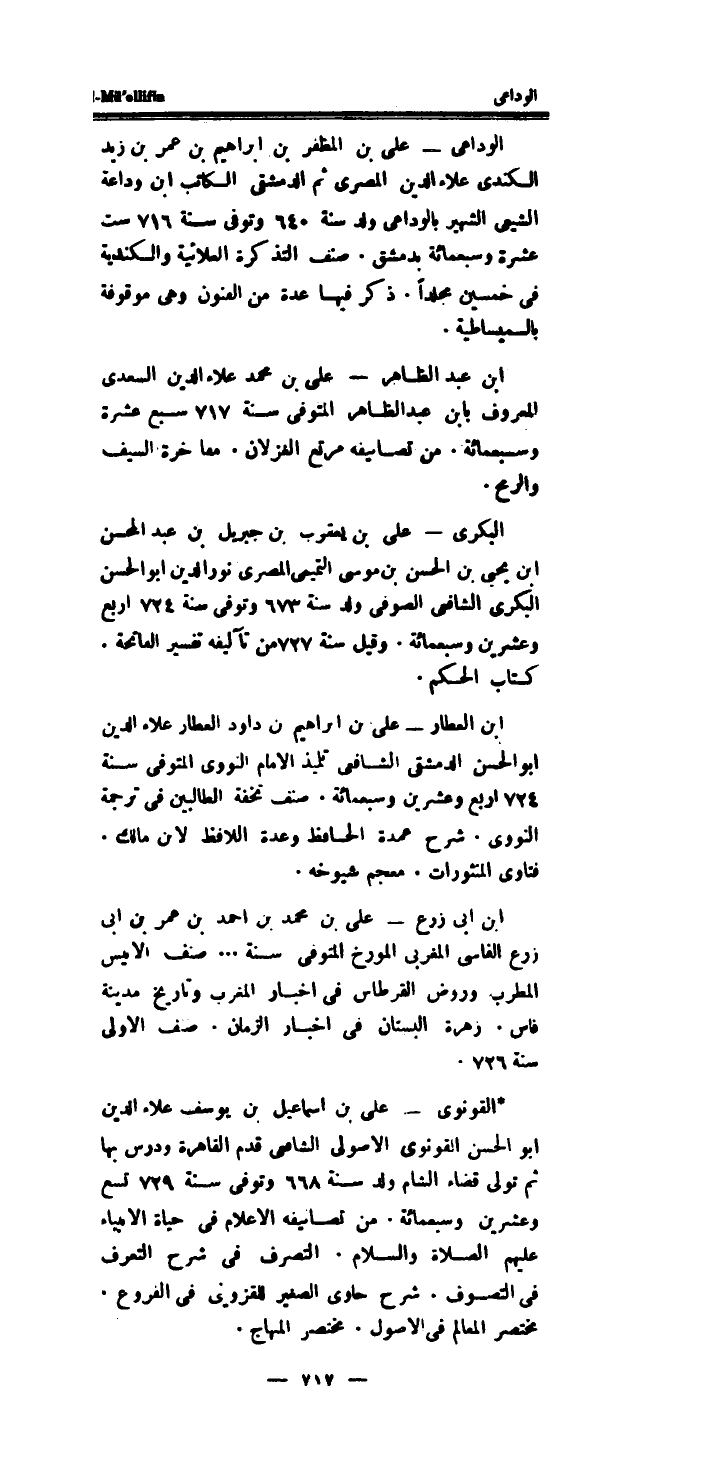 الوداعى - على بن المظفر بن ابراهيم بن عمر بن زيد الكندى عَلَاء الدَّين المصرى ثمَّ الدِّمَشْقِي الْكَاتِب ابْن ودَاعَة الشيعي الشهير بالوداعى ولد سنة 640 وَتوفى سنة 716 سِتّ عشرَة وَسَبْعمائة بِدِمَشْق.