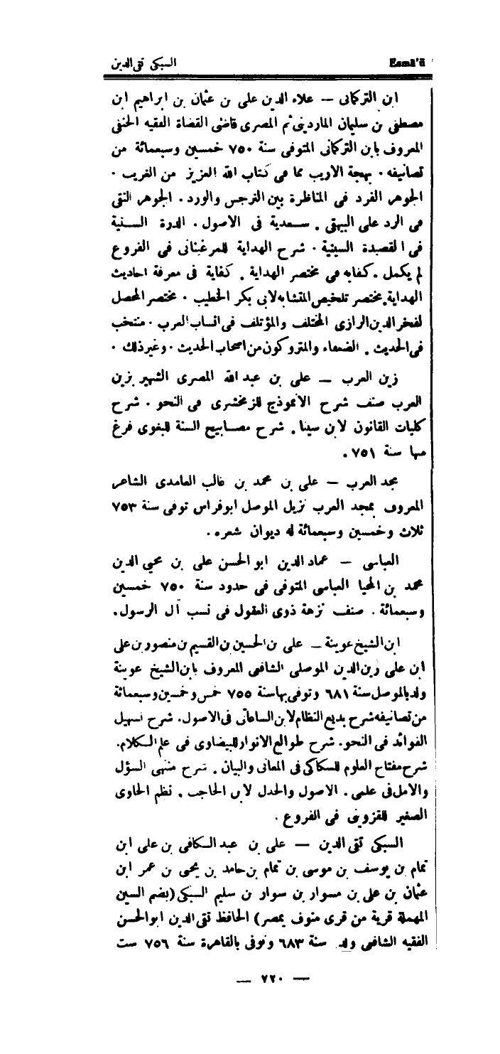 ابْن التركماني - عَلَاء الدَّين على بن عُثْمَان بن ابراهيم ابْن مصطفى بن سُلَيْمَان الماردينى ثمَّ المصرى قاضى الْقُضَاة الْفَقِيه الْحَنَفِيّ الْمَعْرُوف بِابْن التركماني الْمُتَوفَّى سنة 750 خمسين وَسَبْعمائة من تصانيفه.