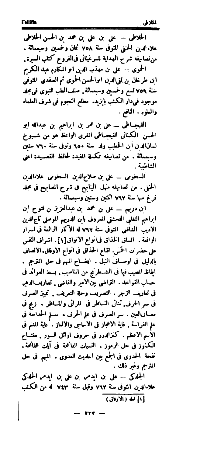الجلدكى - على بن ايدمر بن على بن ايدمر الحلدكى عَلَاء الدَّين الْمُتَوفَّى سنة 762 وَقيل سنة 743 لَهُ من الْكتب