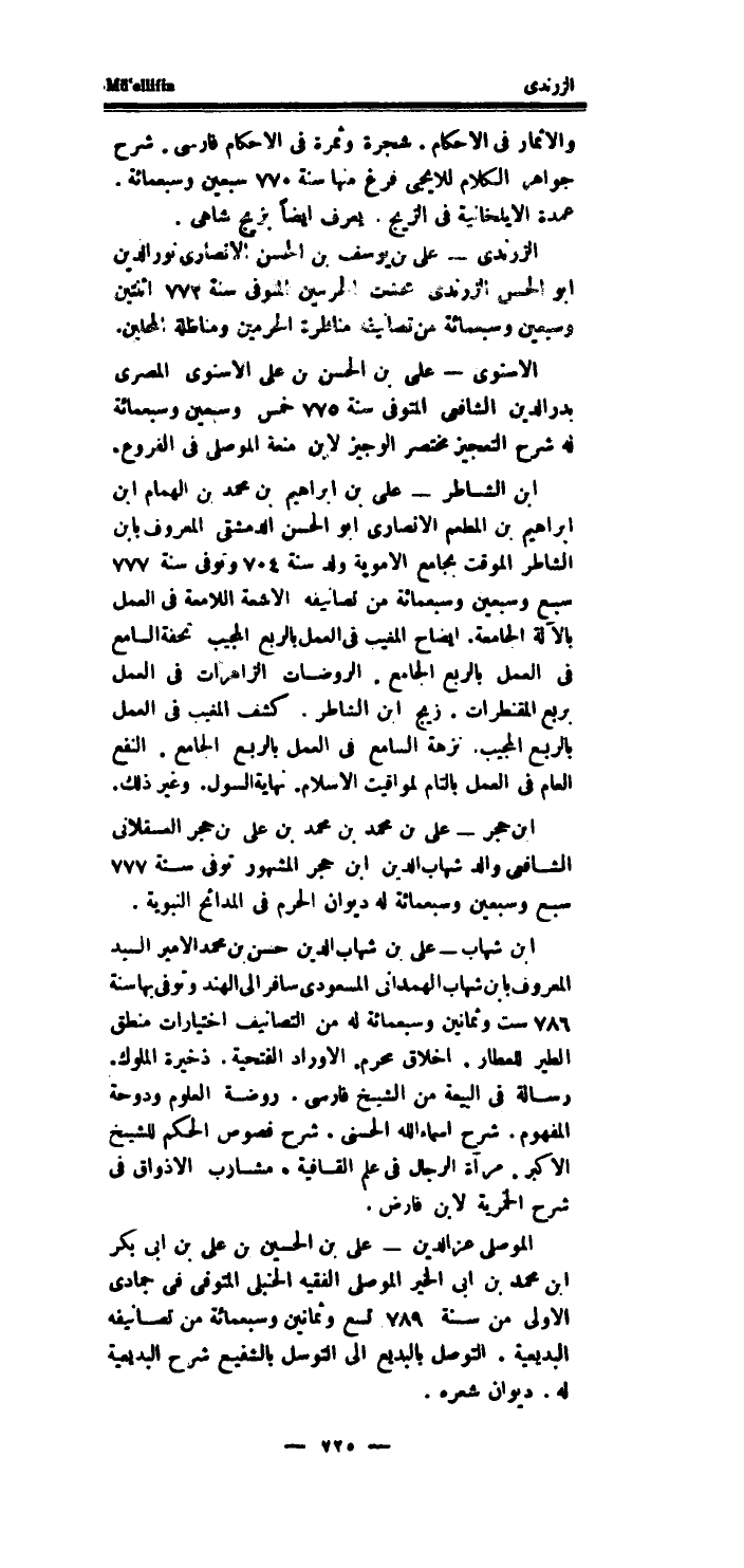 الزرندى - على بن يُوسُف بن الْحسن الانصاري نور الدَّين أَبُو الْحسن الزرندى مُحدث الْحَرَمَيْنِ الْمُتَوفَّى سنة 772 اثْنَتَيْنِ وَسبعين وَسَبْعمائة من تصانيفه مناظرة الْحَرَمَيْنِ ومناظلة المحلين.