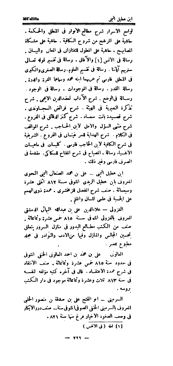 العالونى - على بن مُحَمَّد بن احْمَد العالونى الْحَنَفِيّ الْمُتَوفَّى فِي حُدُود سنة 815 خمس عشرَة وَثَمَانمِائَة.