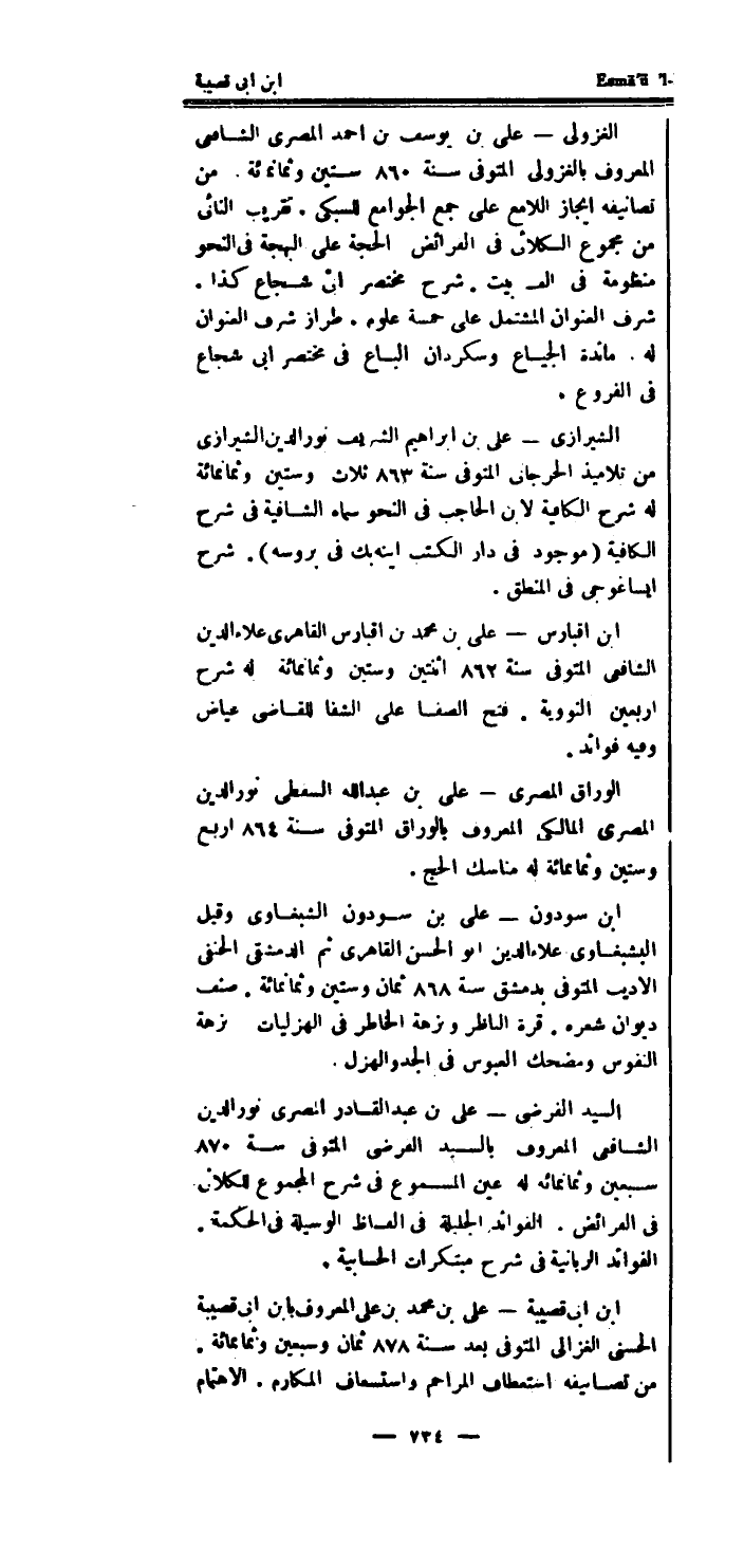 الشِّيرَازِيّ - على بن ابراهيم الشريف نور الدَّين الشِّيرَازِيّ من تلاميذ الحرجانى الْمُتَوفَّى سنة 863 ثَلَاث وَسِتِّينَ وَثَمَانمِائَة لَهُ شرح الكافية لِابْنِ الْحَاجِب فِي النَّحْو سَمَّاهُ الشافية فِي شرح الكافية (مَوْجُود فِي دَار الْكتب اينه بك فِي بروسه) .