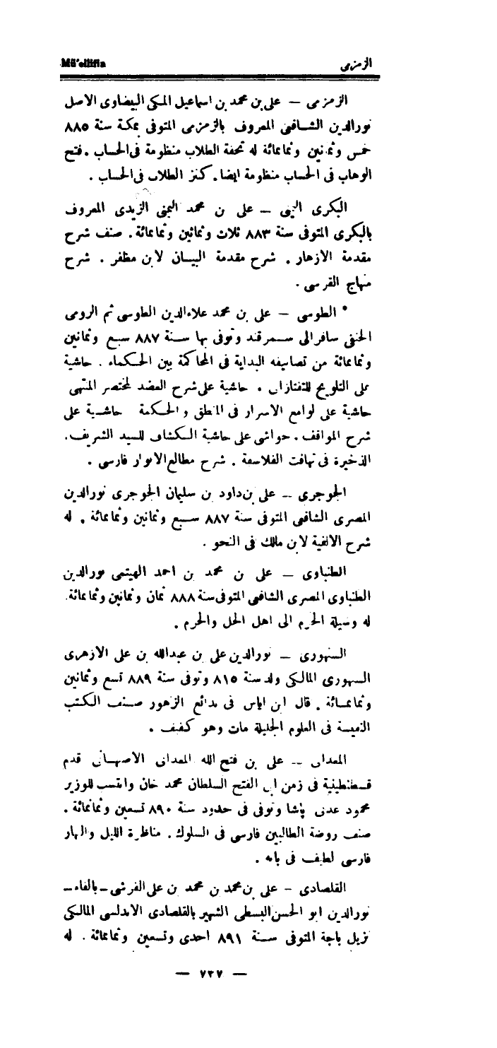 الزمزمى - على بن مُحَمَّد بن اسماعيل المكى البيضاوى الاصل نور الدَّين الشَّافِعِي الْمَعْرُوف بالزمزمى الْمُتَوفَّى بِمَكَّة سنة 885 خمس وَثَمَانِينَ وَثَمَانمِائَة لَهُ تحفة الطلاب منظومة فِي الْحساب.