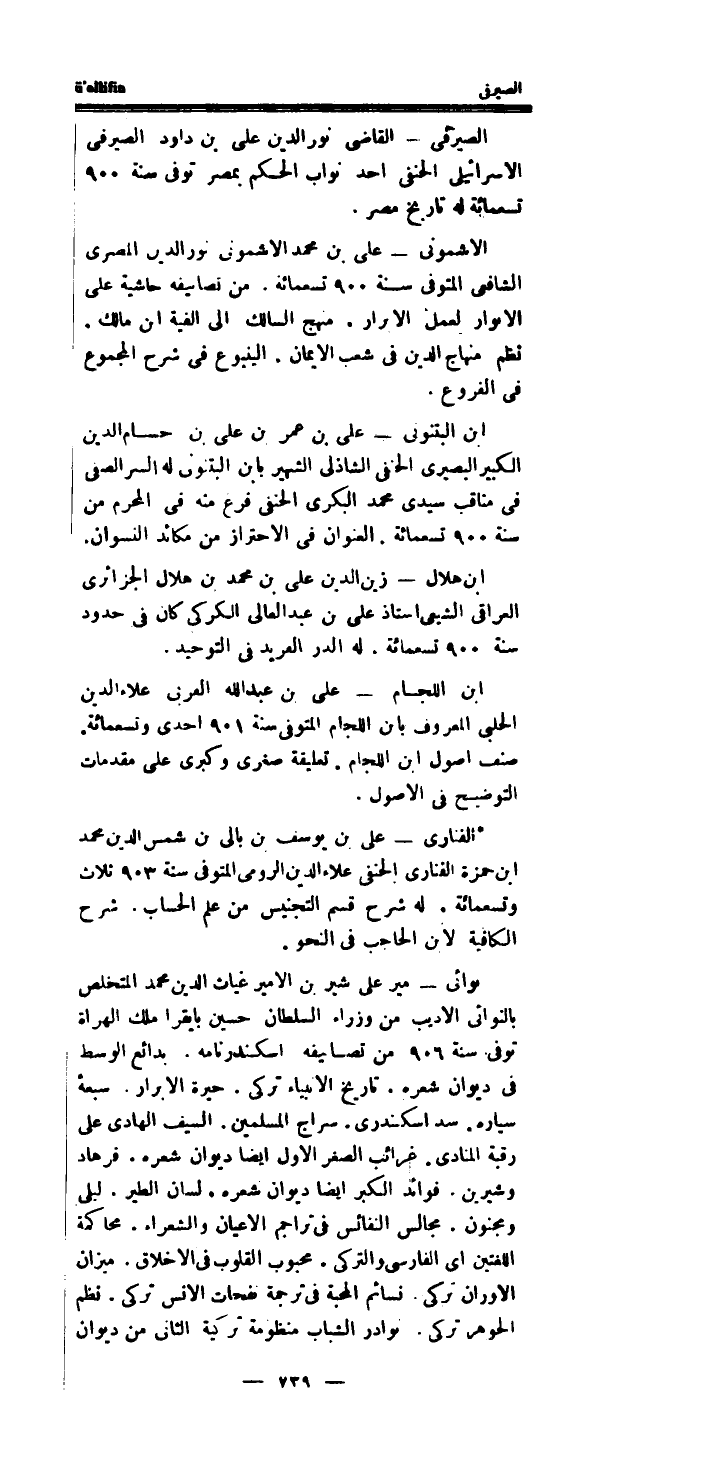 * الفنارى - على بن يُوسُف بن بالى بن شمس الدَّين مُحَمَّد ابْن حَمْزَة الفنارى الْحَنَفِيّ عَلَاء الدَّين الرُّومِي الْمُتَوفَّى سنة 903 ثَلَاث وَتِسْعمِائَة.