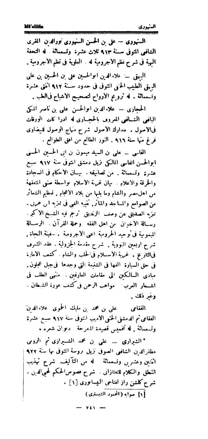 السنهوري - على بن الْحسن السنهوري نور الدَّين المقرى الشَّافِعِي الْمُتَوفَّى سنة 913 ثَلَاث عشرَة وَتِسْعمِائَة.