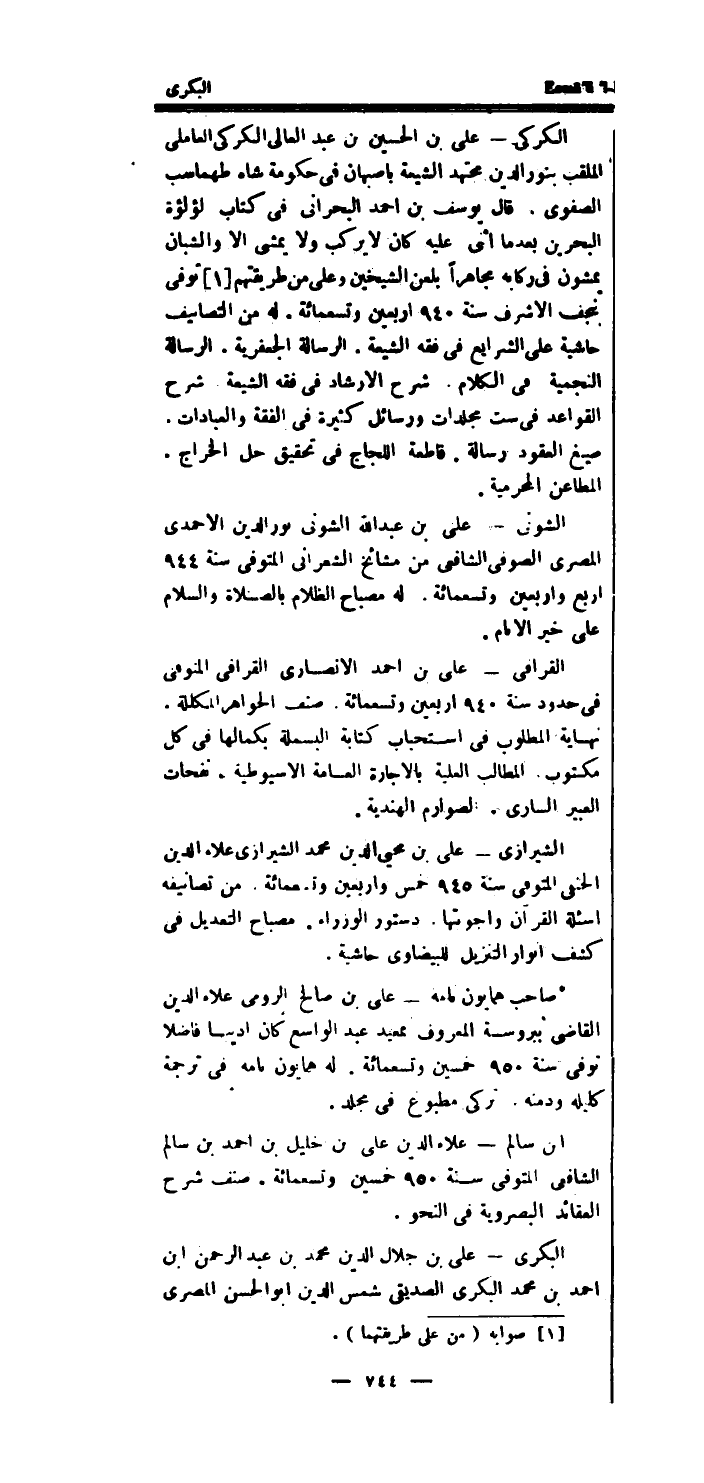 الكركي - على بن الْحُسَيْن بن عبد العالى الكركي العاملي الملقب بِنور الدَّين مُجْتَهد الشِّيعَة باصبهان فِي حُكُومَة شاه طهماسب الصفوى.